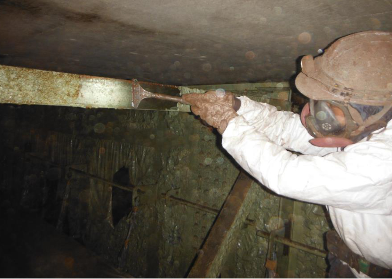 同剥離剤は、500μmまでは1回塗布するだけで剥離可能であるが、それ以上の個所については2回塗りして除去している。11月下旬までは寒さも厳しくないことから塗布後24時間でかき落とし作業に入ることができたが、今後は「36~48時間の養生時間が必要になる」(元請の東海・昭和JV)ことを想定している。そのため1月上旬に改めて塗膜剥離剤を試験施工し、使用する製品を決める予定である。また、錆が発生している個所や隅角部などの剥離作業についてはスクレーパーや鋲かき、ケレン棒、ワイヤーブラシなど手工具による剥離作業や電動工具によるケレンを採用している。